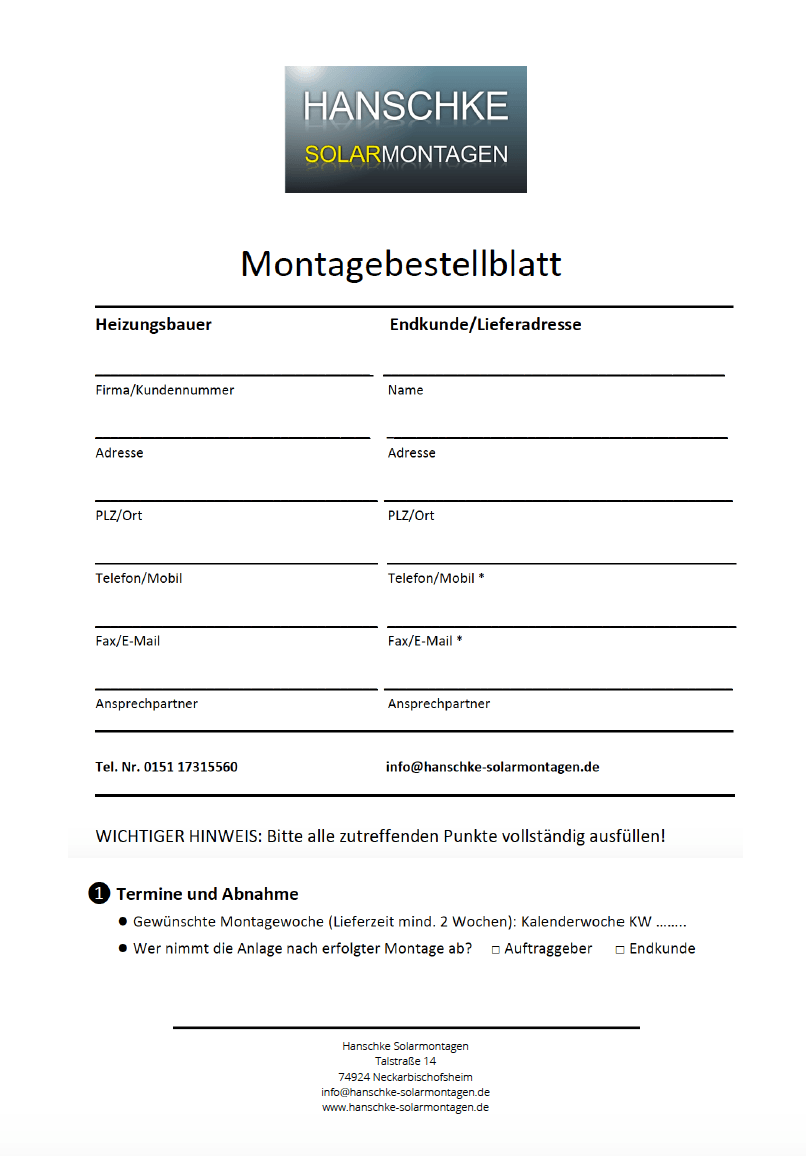 Für eine konkrete Montagebestellung, laden Sie sich gerne unser Montagbestellblatt herunter und senden Sie es ausgefüllt per Mail an uns zurück.